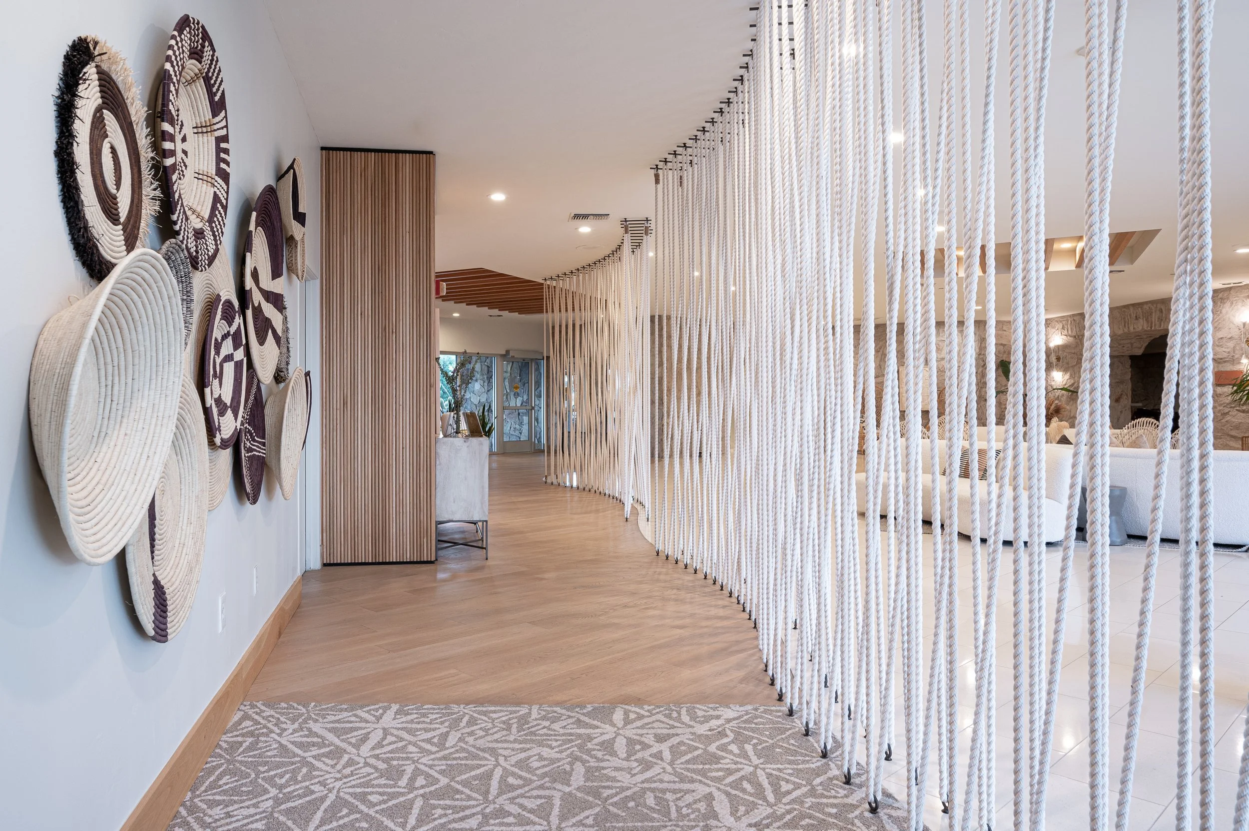 When designing the Civana Lobby at CIVANA Resort and Spa, our vision was to create a space that embodies the serene beauty of the desert while offering a seamless sense of arrival. A refined balance of texture, tone, and materiality defines the space, where modern desert minimalism meets effortless comfort. Sculptural rope dividers trace the curved transition between wood and tile, maintaining openness while introducing a sense of intimacy—particularly within the check-in experience. Tambour wood-clad walls and reception pods create a rhythmic, organic backdrop, grounding the space in warmth and natural refinement.